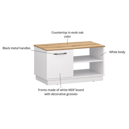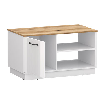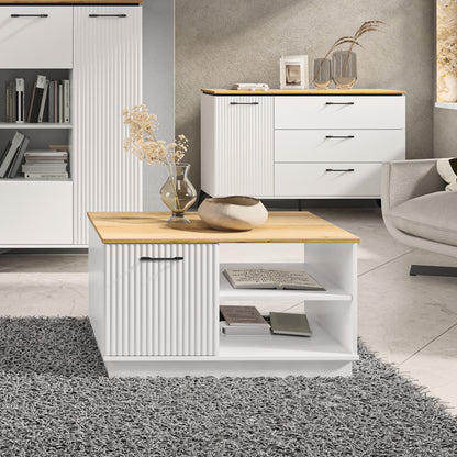 The Velutto coffee table is a smart and stylish addition to your living room. Featuring two open shelves and a closed cabinet under the top, it keeps essentials like remotes, game controllers, and snacks neatly organised. The top surface is perfect for serving drinks and small treats.