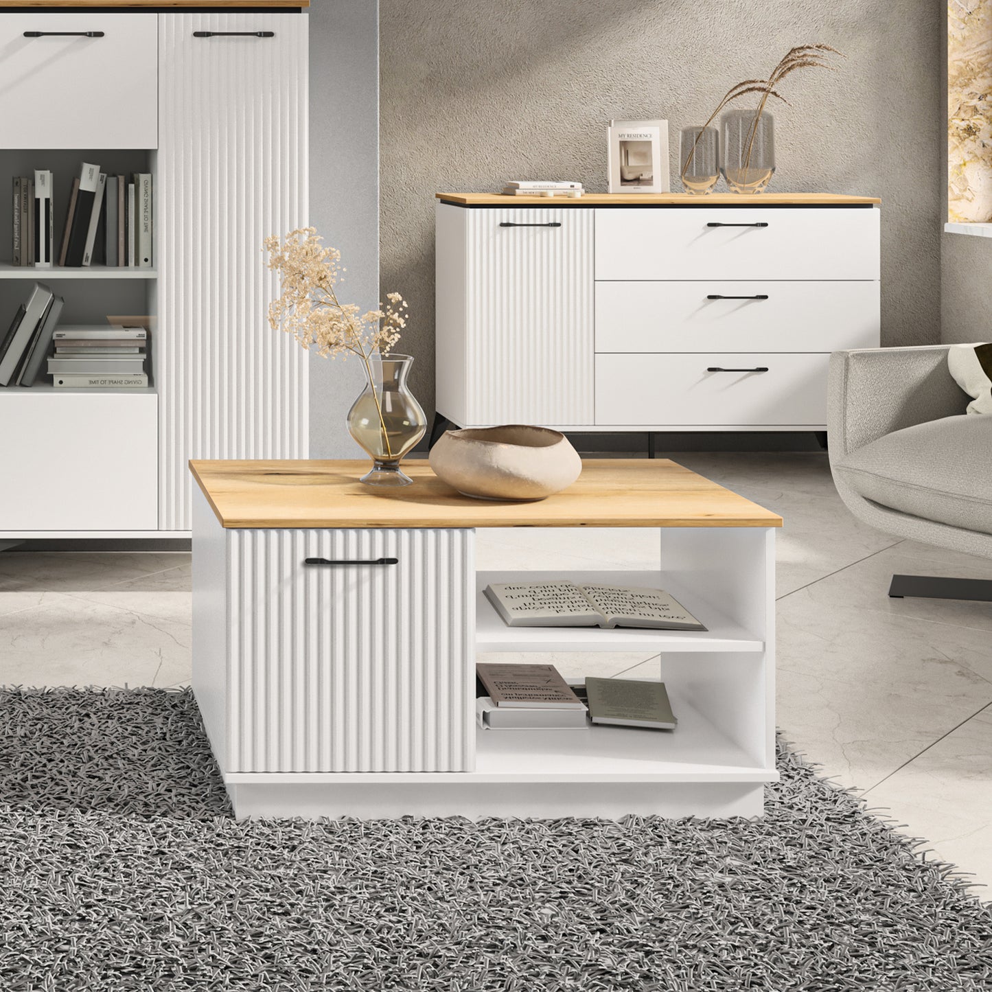 With fluted fronts, a wood-effect oak top, and black metal accents, it brings warmth and elegance to any modern interior.