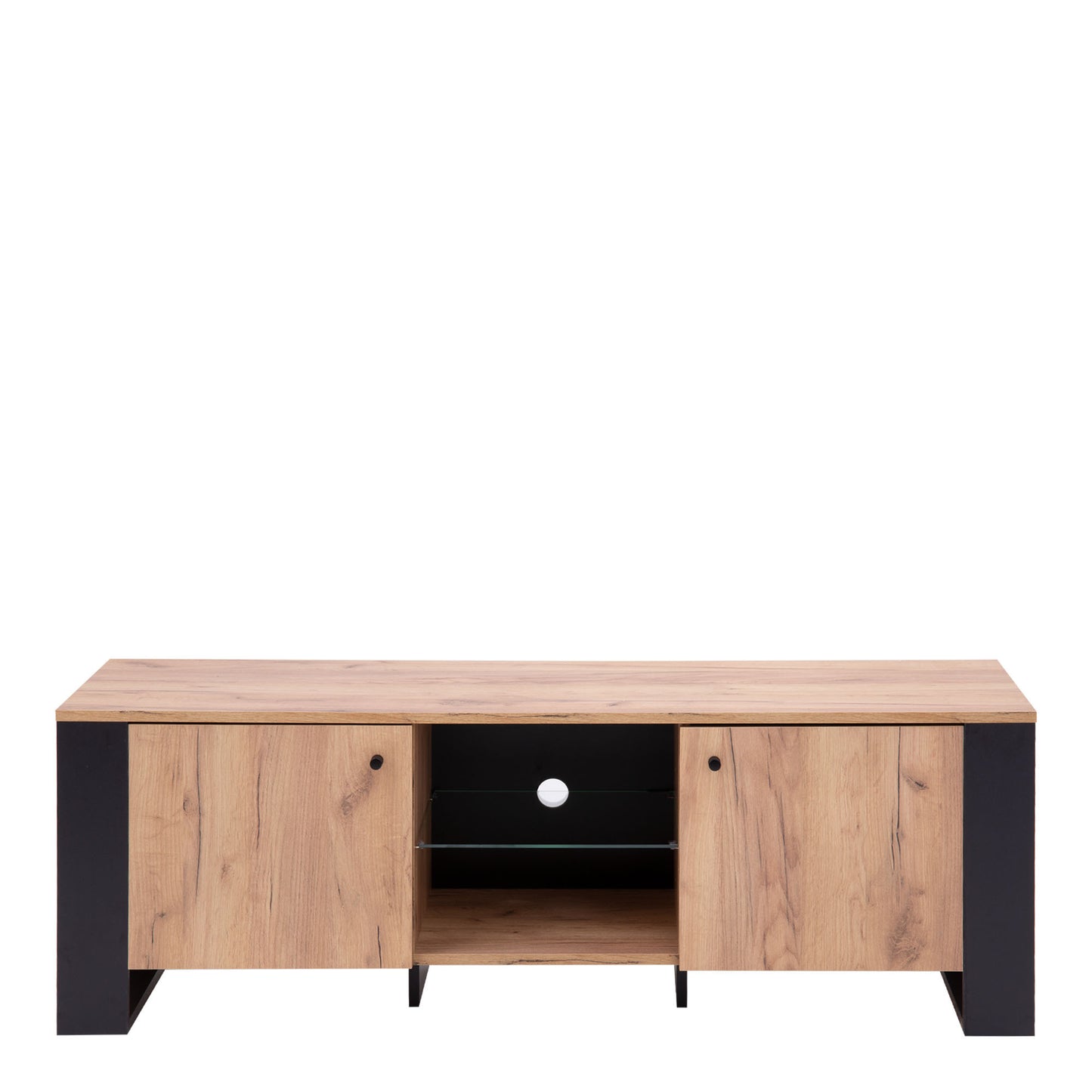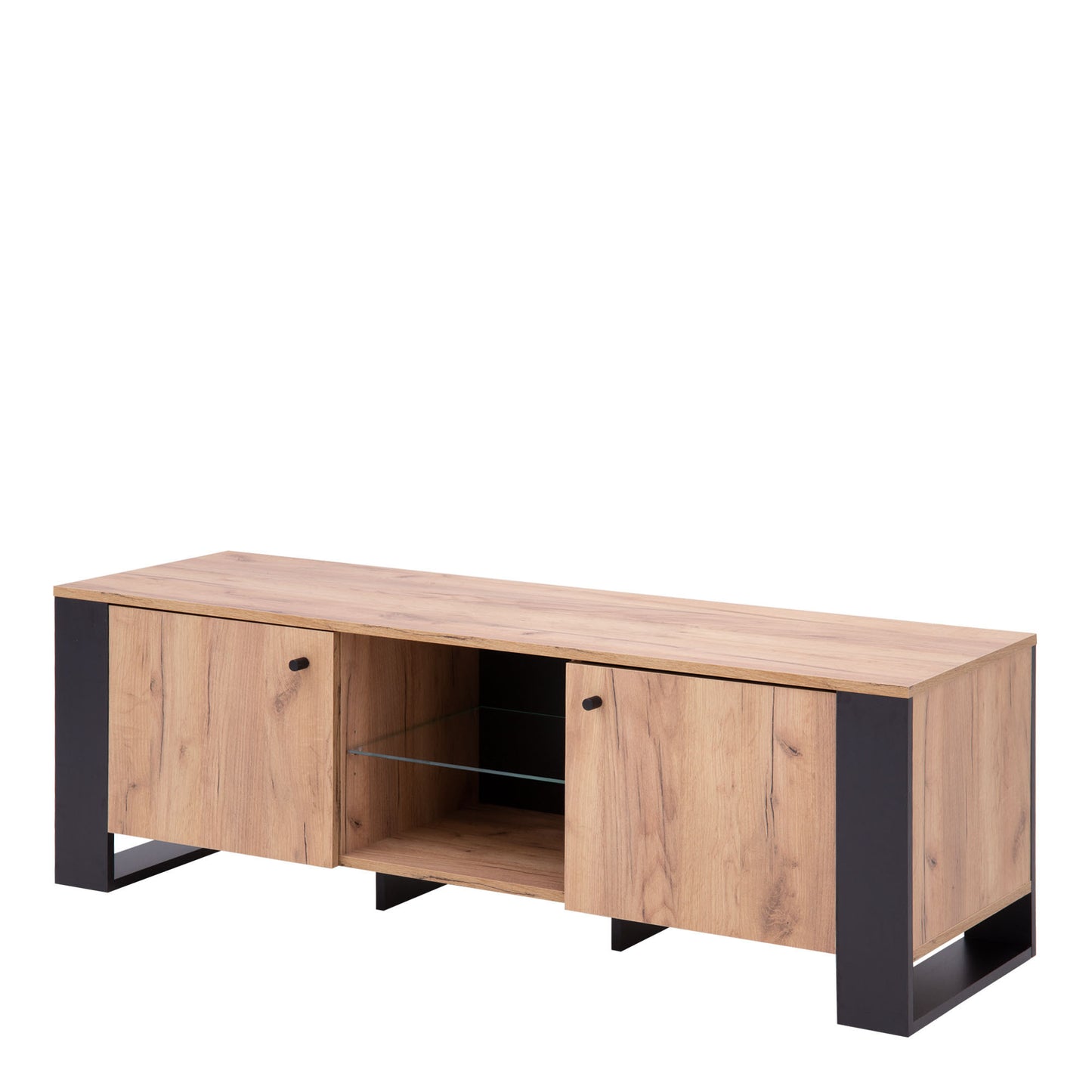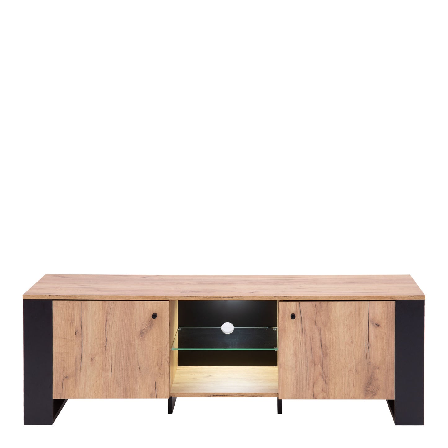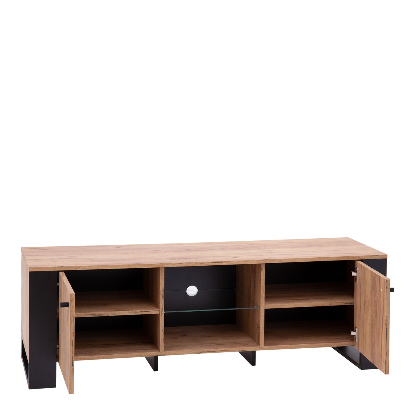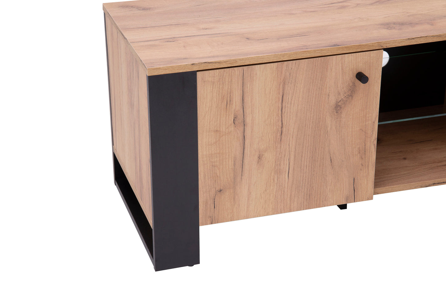 The WOOD TV cabinet features shelves enclosed behind doors and an open glass shelf, which can optionally be illuminated. Designed to hold a television, it also provides storage for other TV equipment, remotes, discs, and magazines. Its simple design and minimalist handles highlight the oak-like finish. The open display section with a glass shelf adds lightness to the solid construction, allowing you to showcase decorations or audio-video equipment.